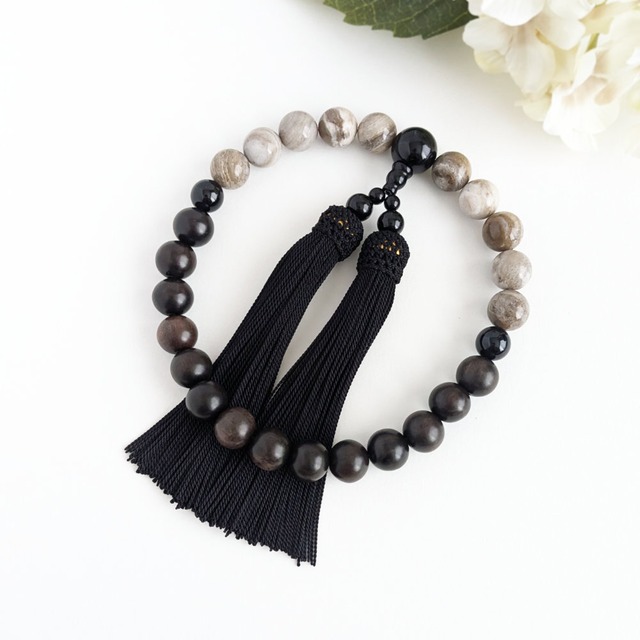 【男性用/主玉12mm】カオリンと黒檀・バイカラーの数珠・略式念珠/正絹漆黒房×オニキス