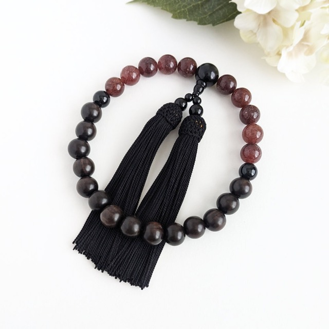 【男性用/主玉12mm】モスコバイトと黒檀・バイカラーの数珠・略式念珠/正絹臙脂房×水晶