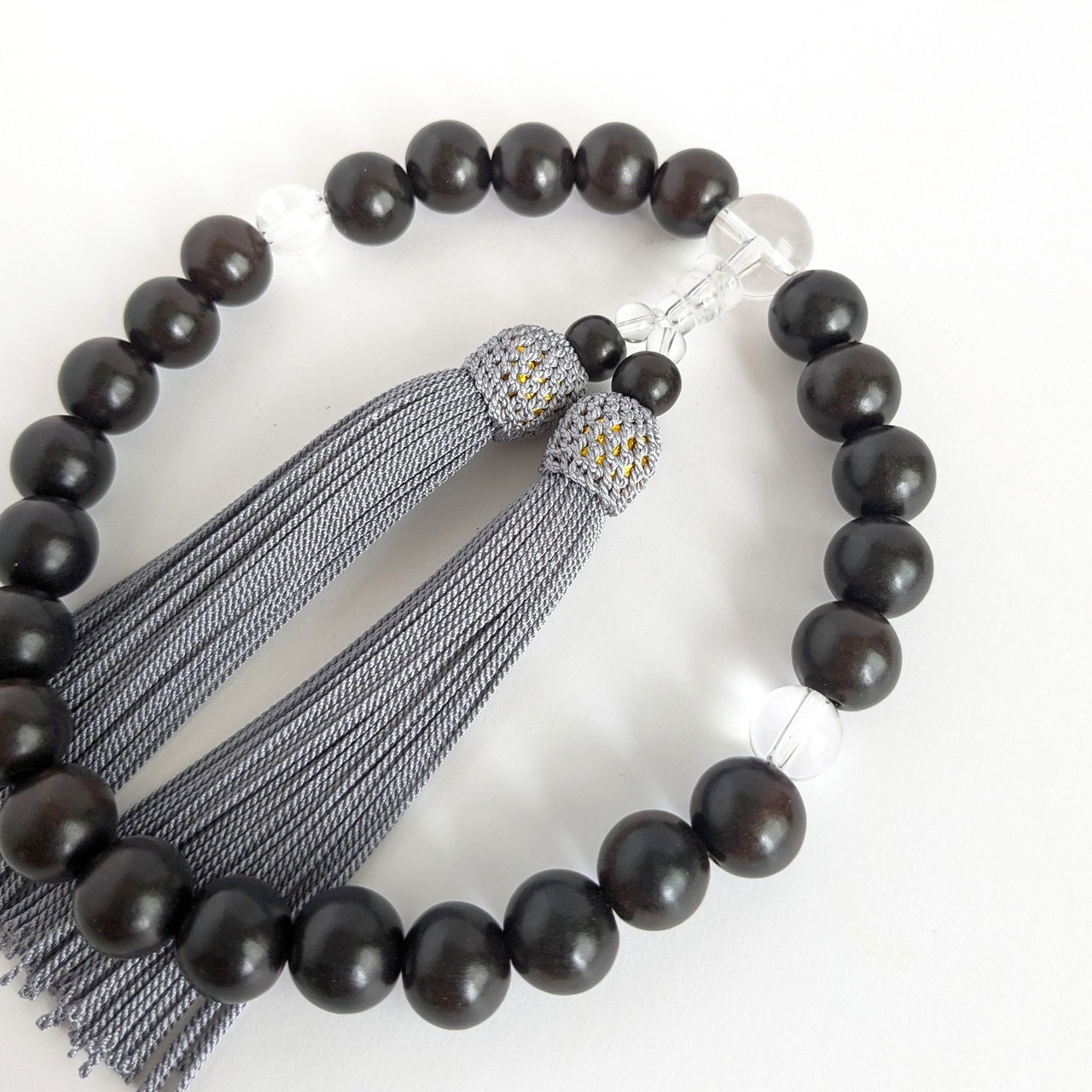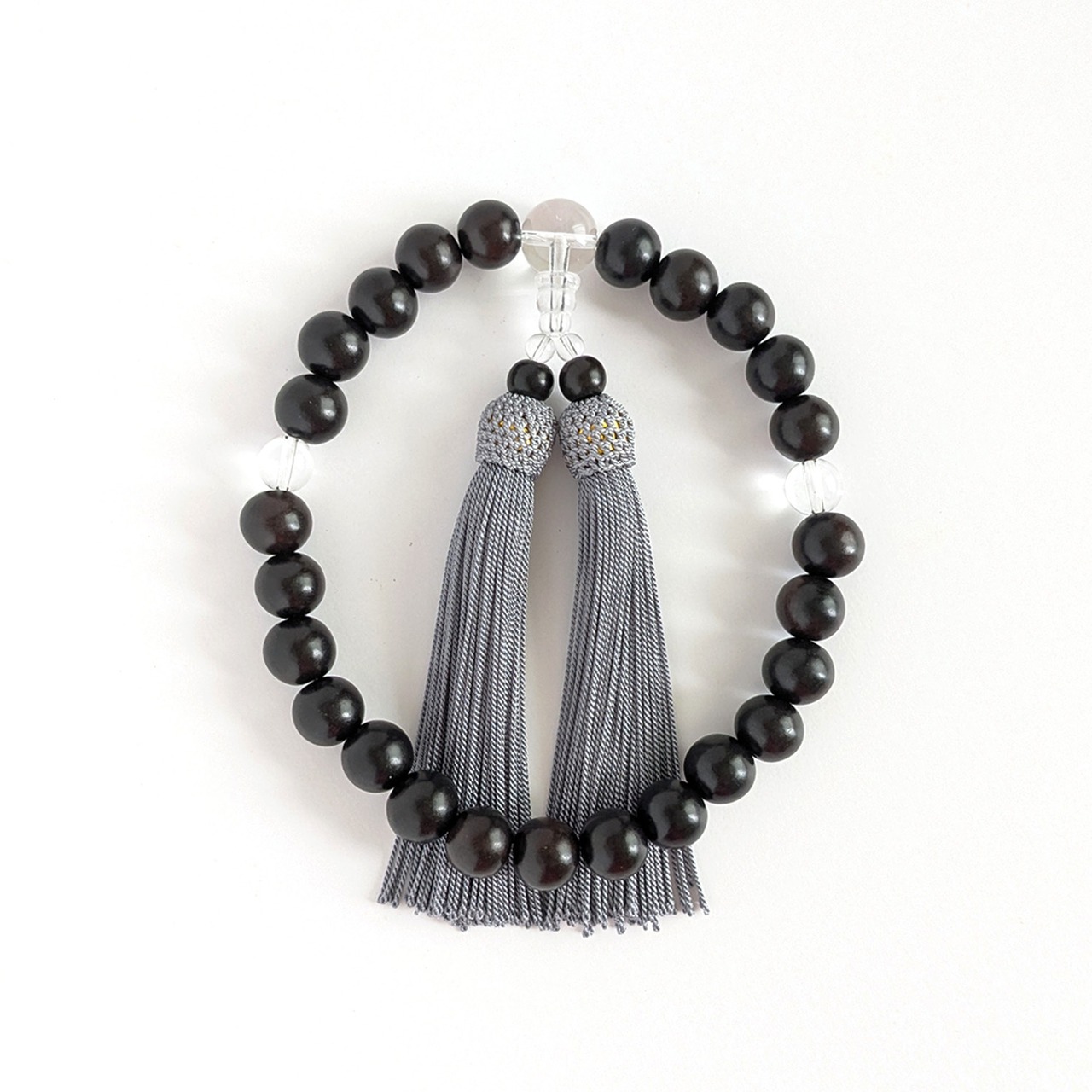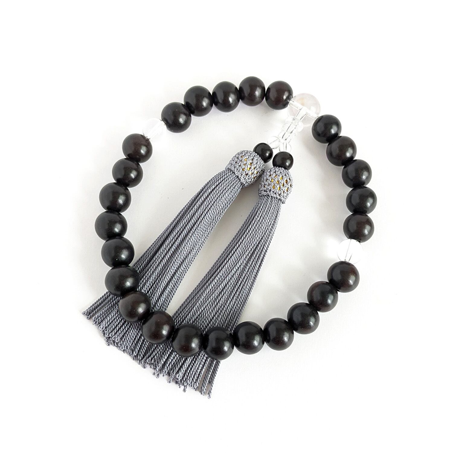 そんな黒檀をメインの主玉に、透明感のある水晶を組み合わせたシンプルな略式数珠です。