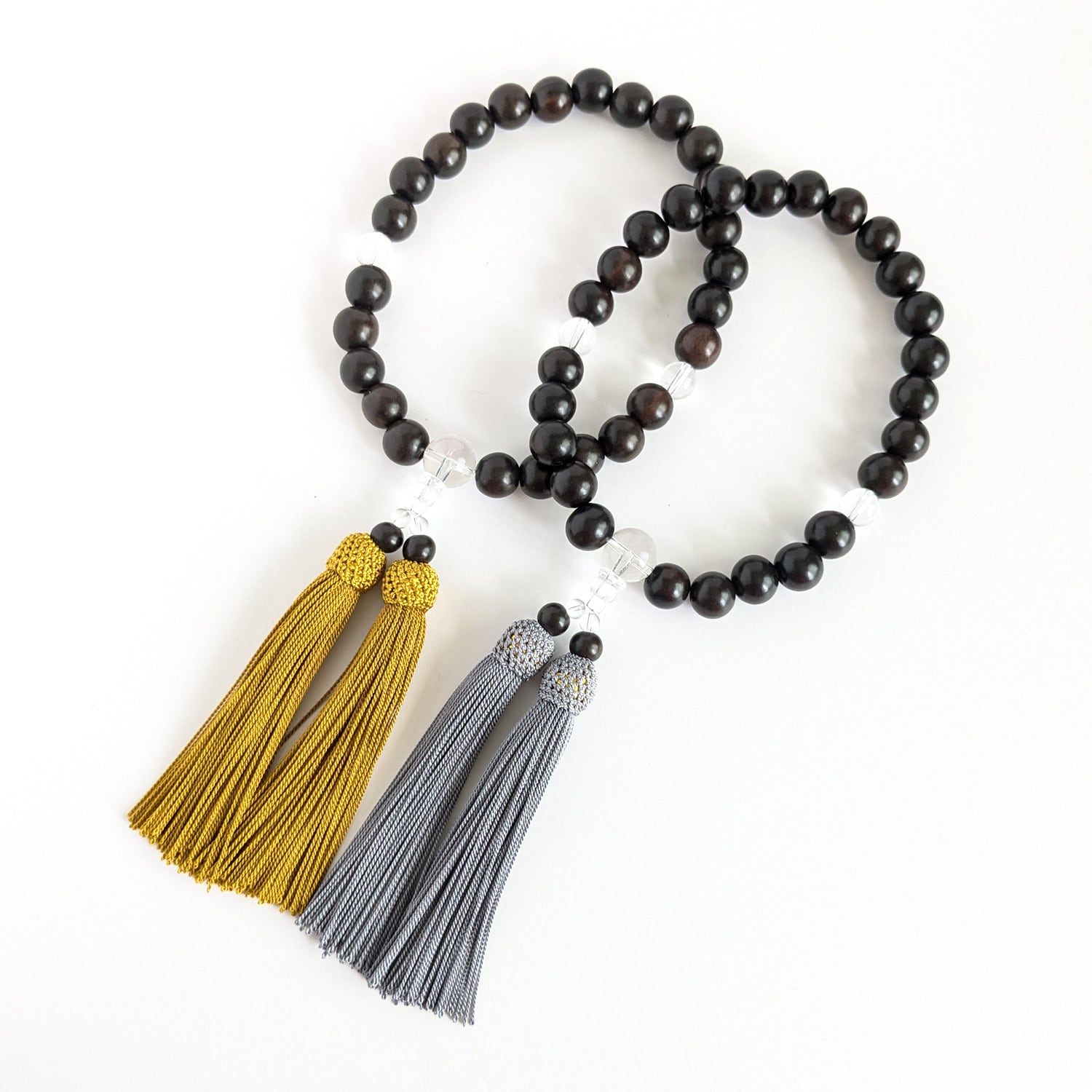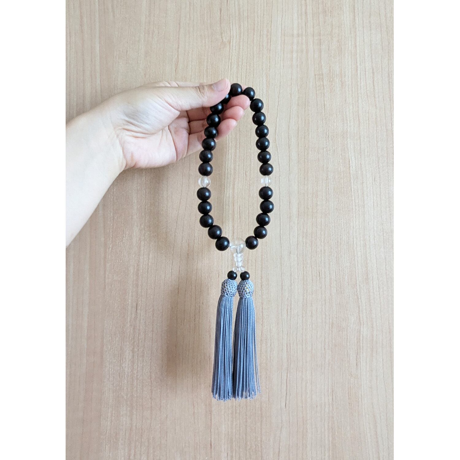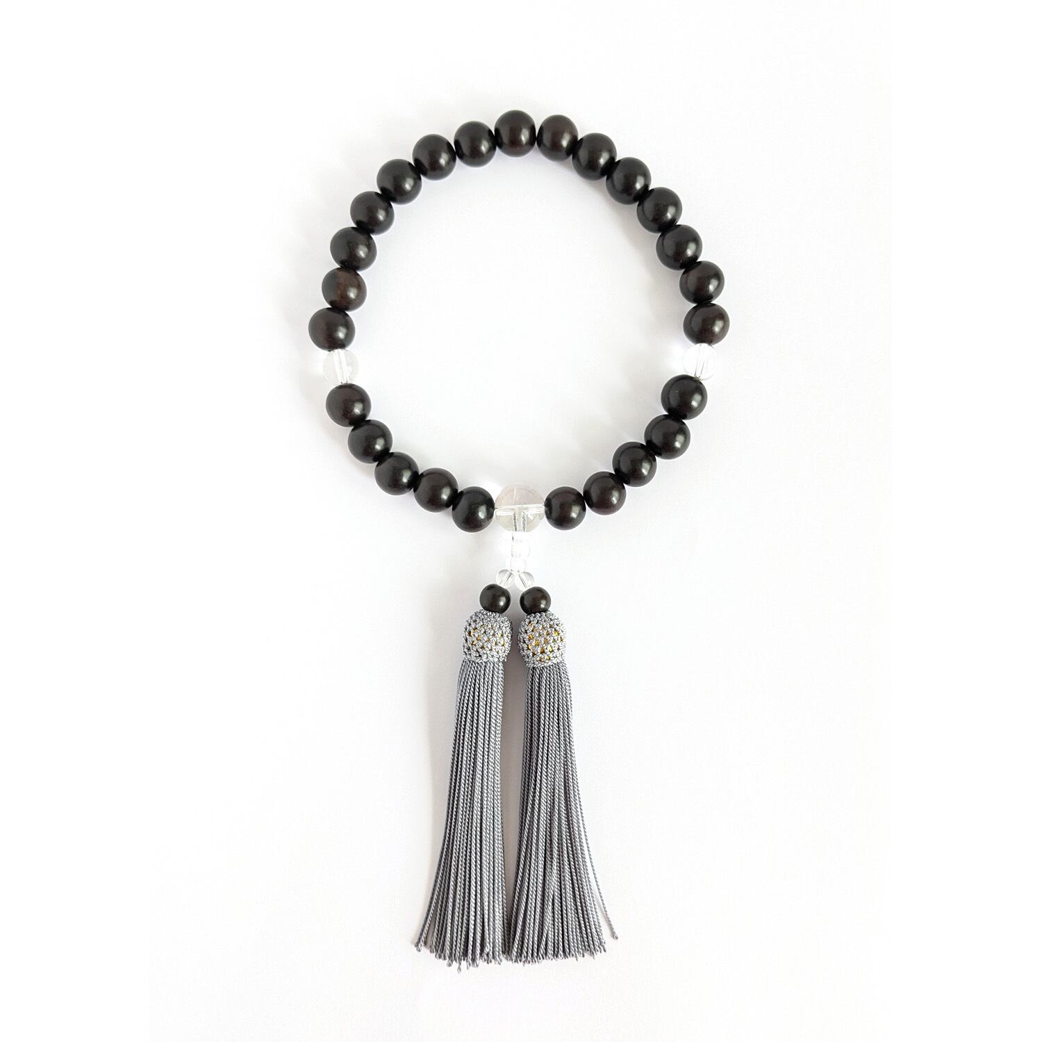 そんな黒檀をメインの主玉に、透明感のある水晶を組み合わせたシンプルな略式数珠です。
