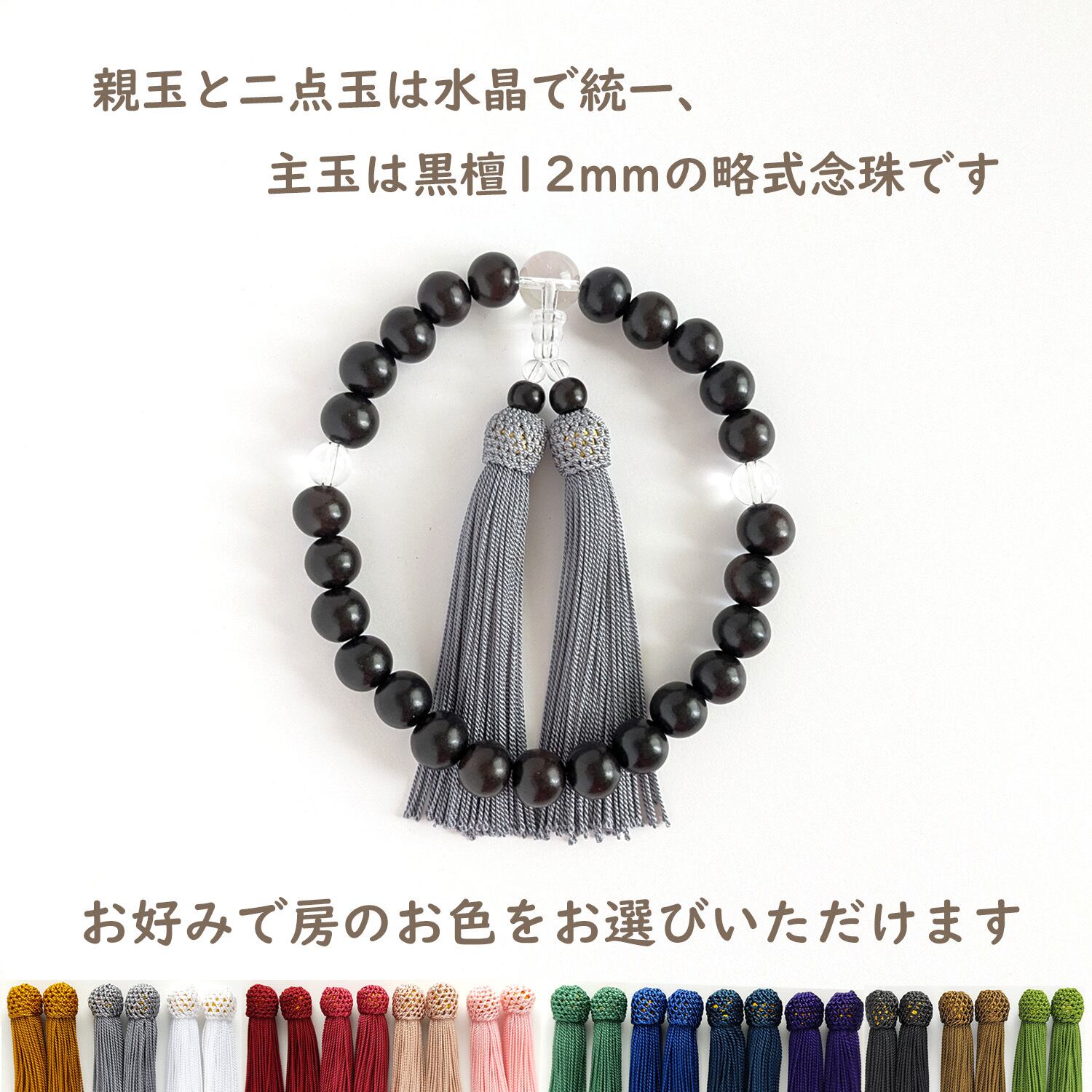 【男性用/主玉12mm】選べる房の色*極みシンプル黒檀と水晶の数珠・略式念珠