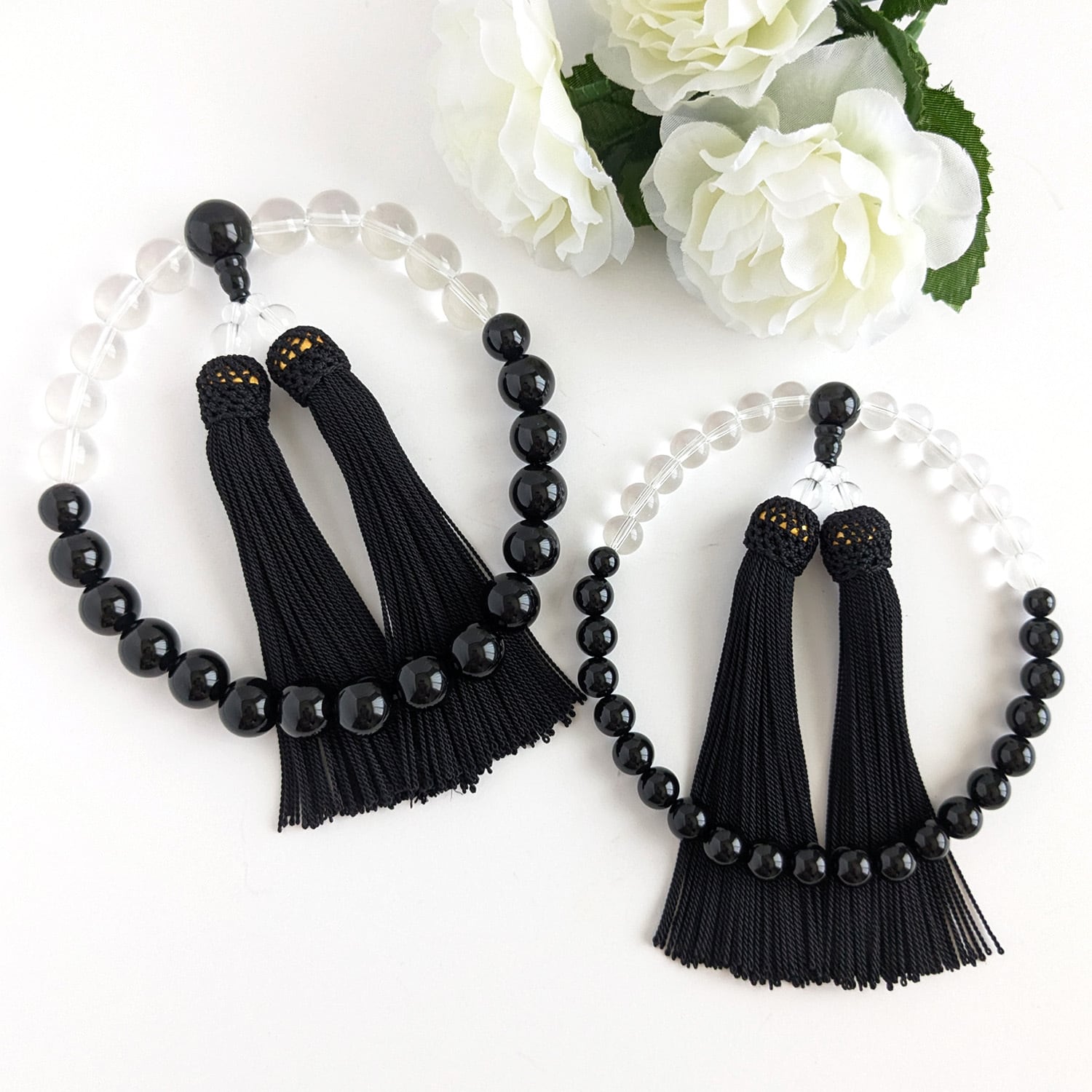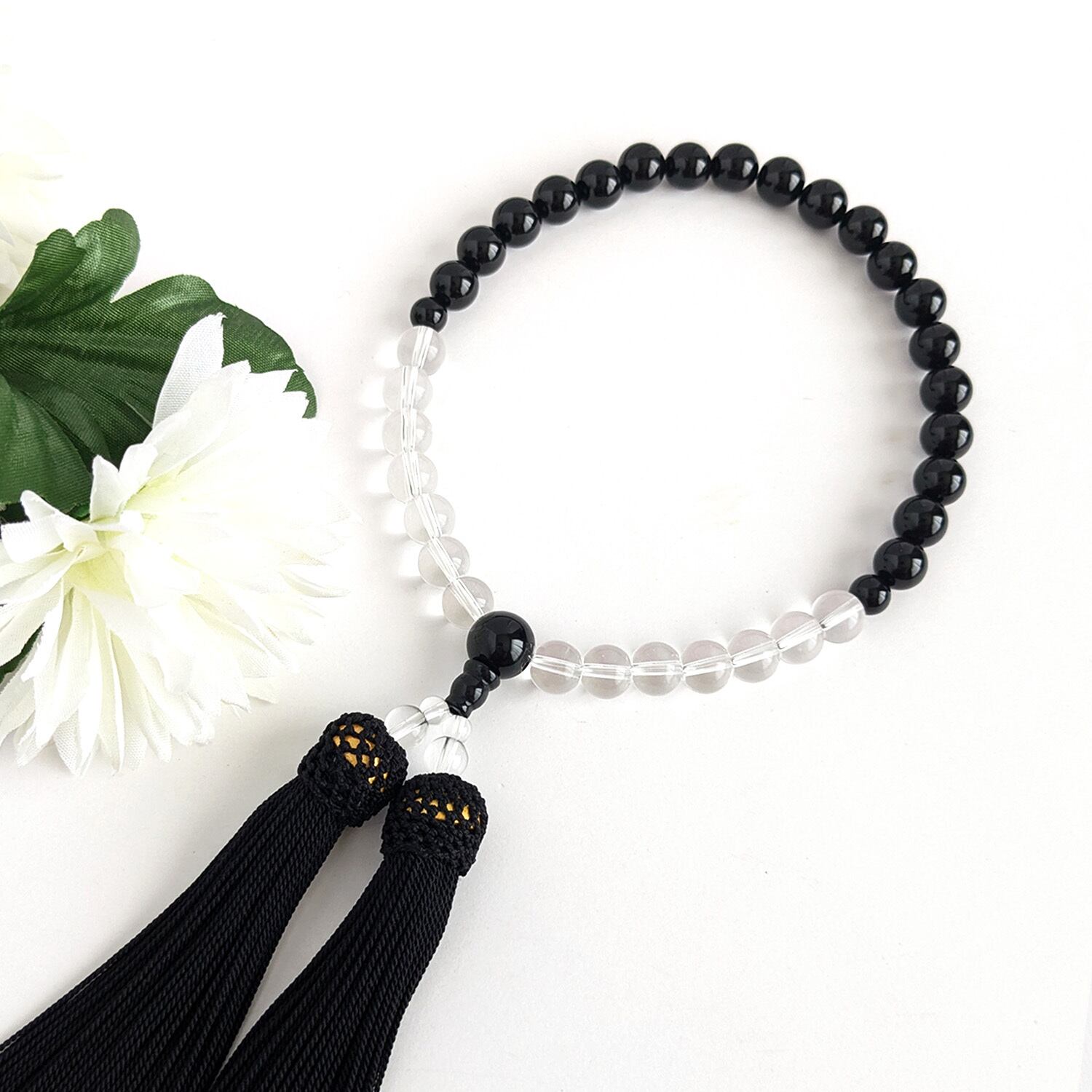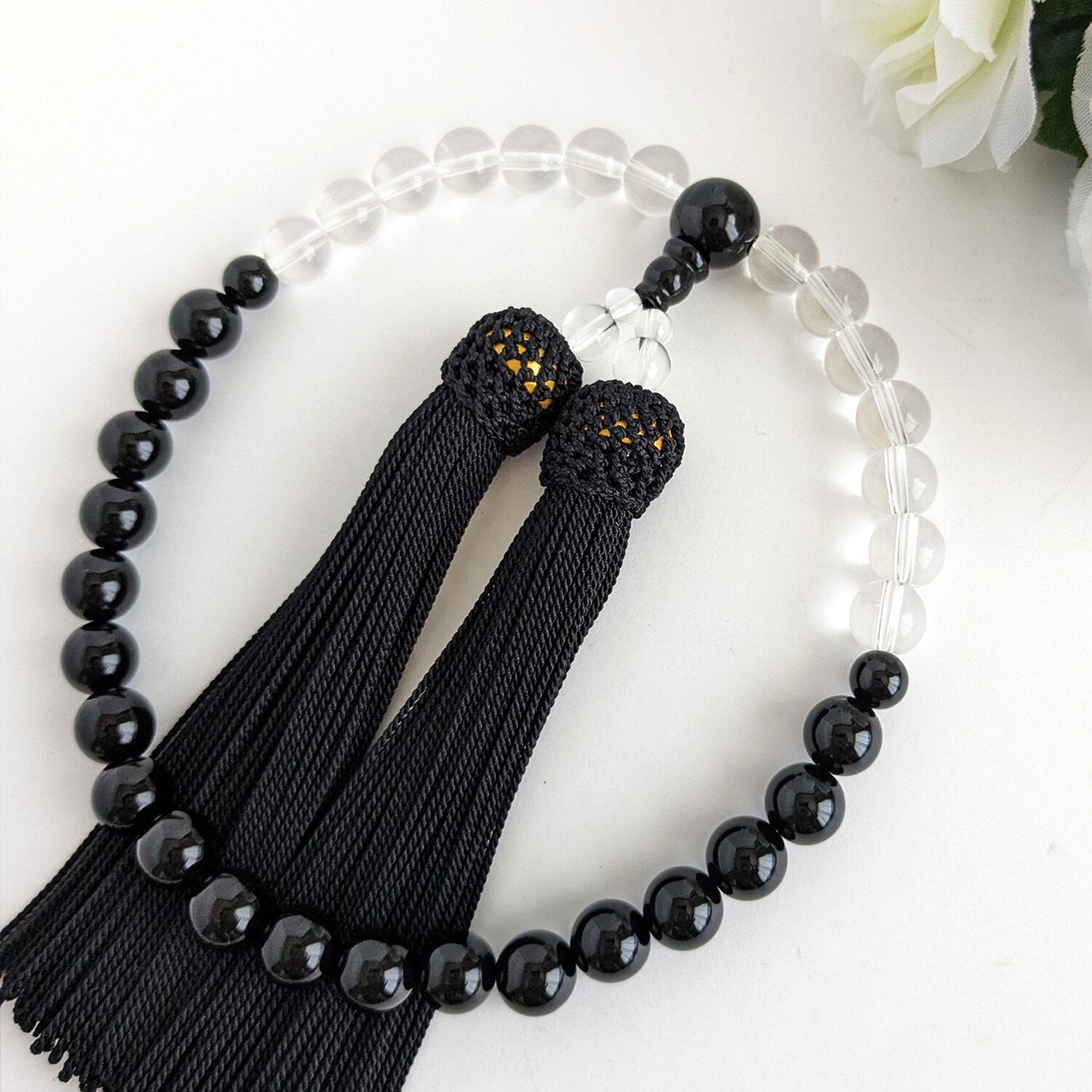 【女性用/主玉8mm】オニキス&水晶・モノトーンの数珠・略式念珠/正絹漆黒房