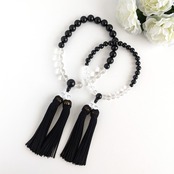 オニキスと水晶をバイカラーに配し、モノトーンの色味がモードな雰囲気を漂わせる略式数珠です。