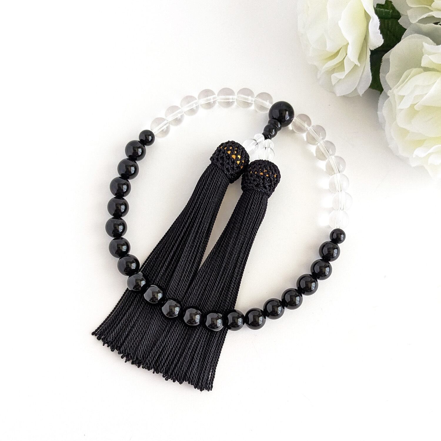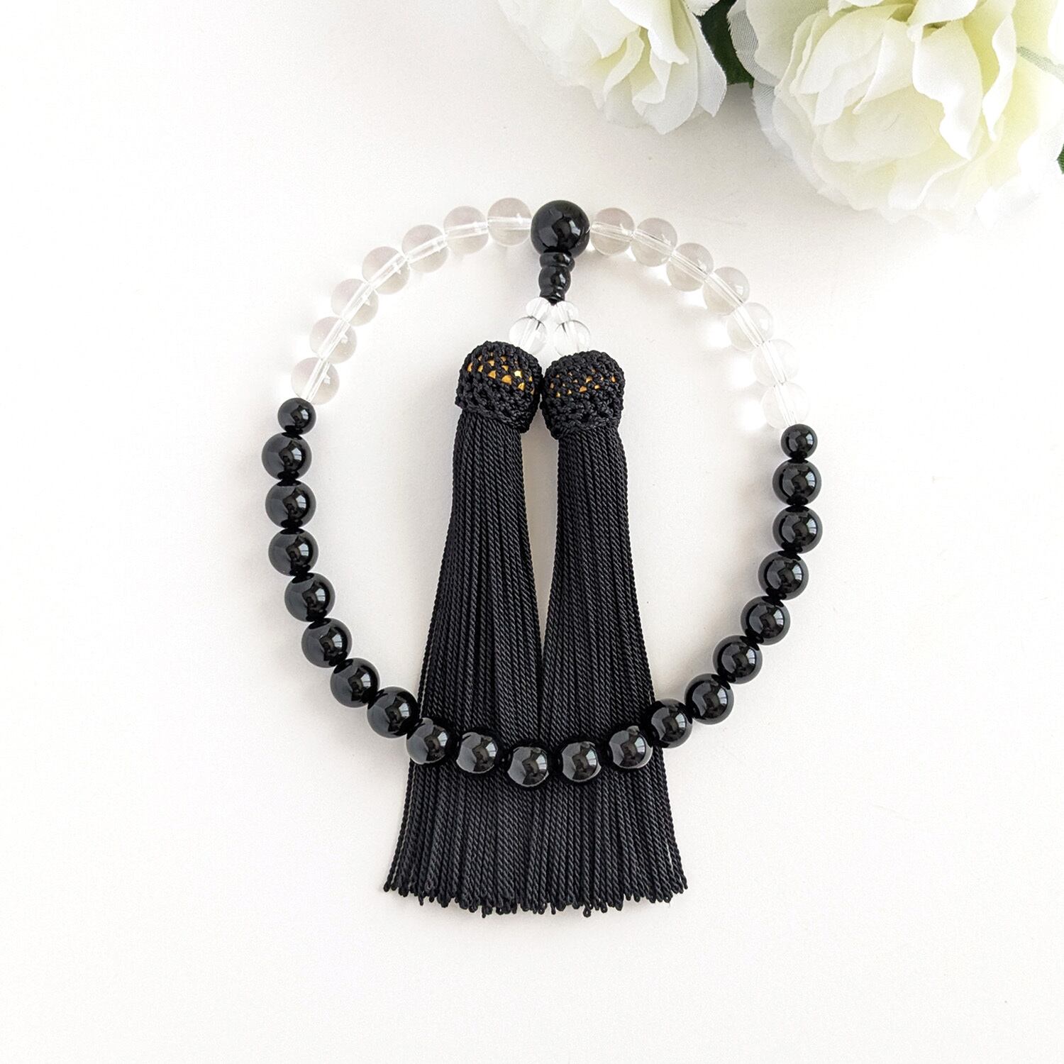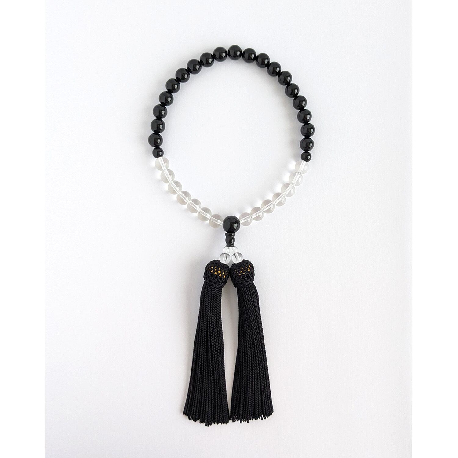 【女性用/主玉8mm】オニキス&水晶・モノトーンの数珠・略式念珠/正絹漆黒房