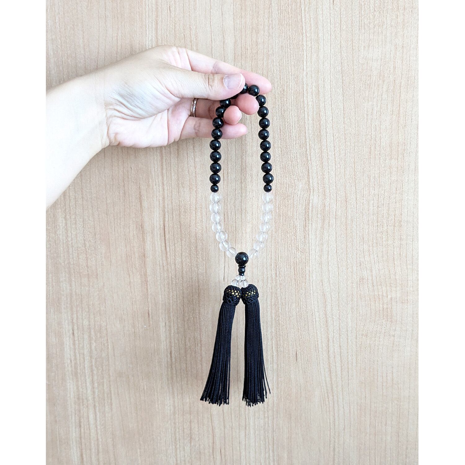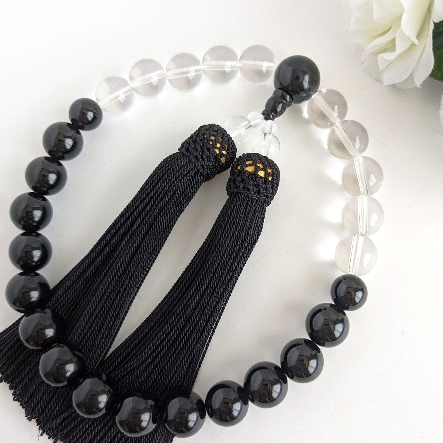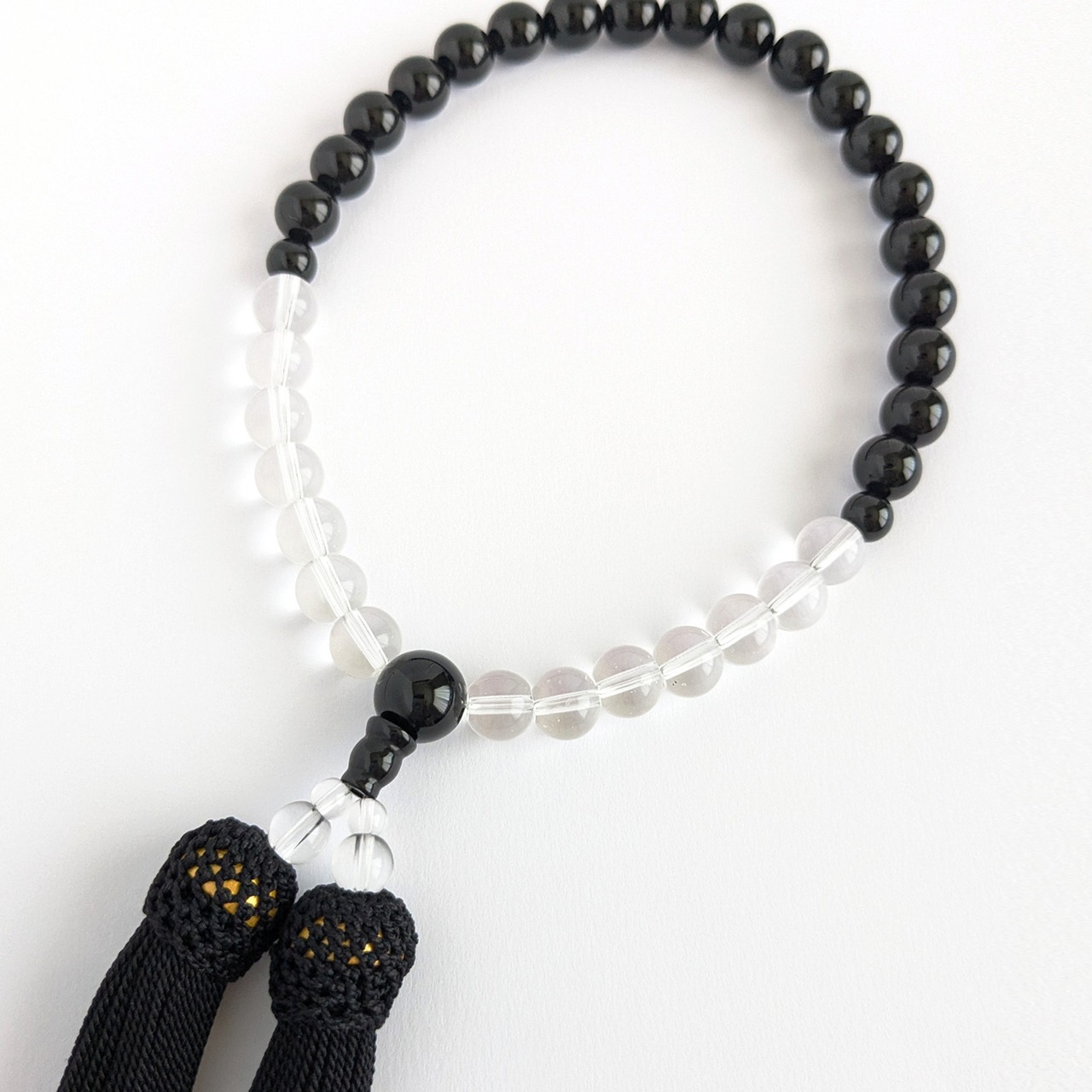 【女性用/主玉8mm】オニキス&水晶・モノトーンの数珠・略式念珠/正絹漆黒房