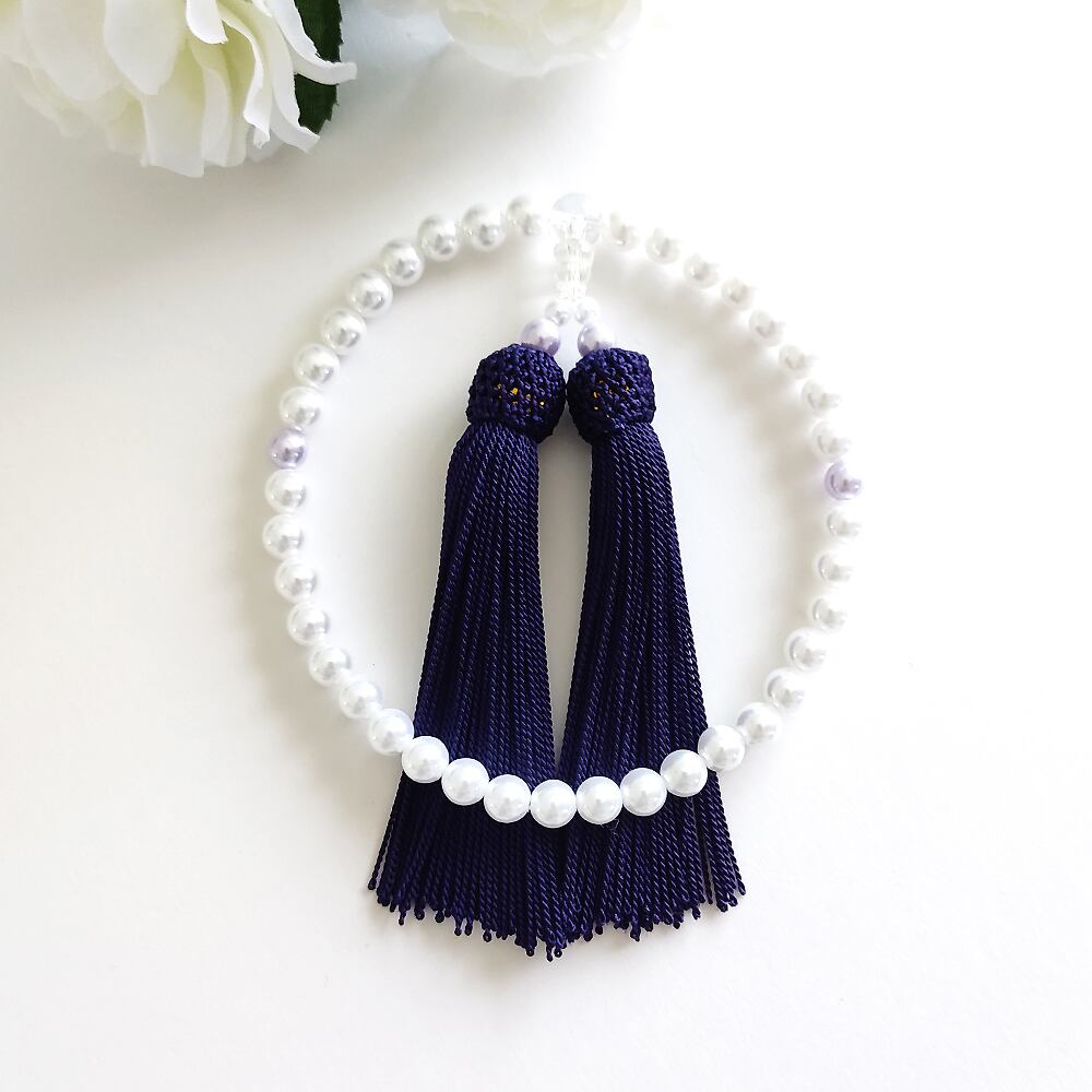 小粒すぎず大粒すぎない7mmのパールを主玉に、房と二点玉のお色をそろえたシンプルな略式数珠です。