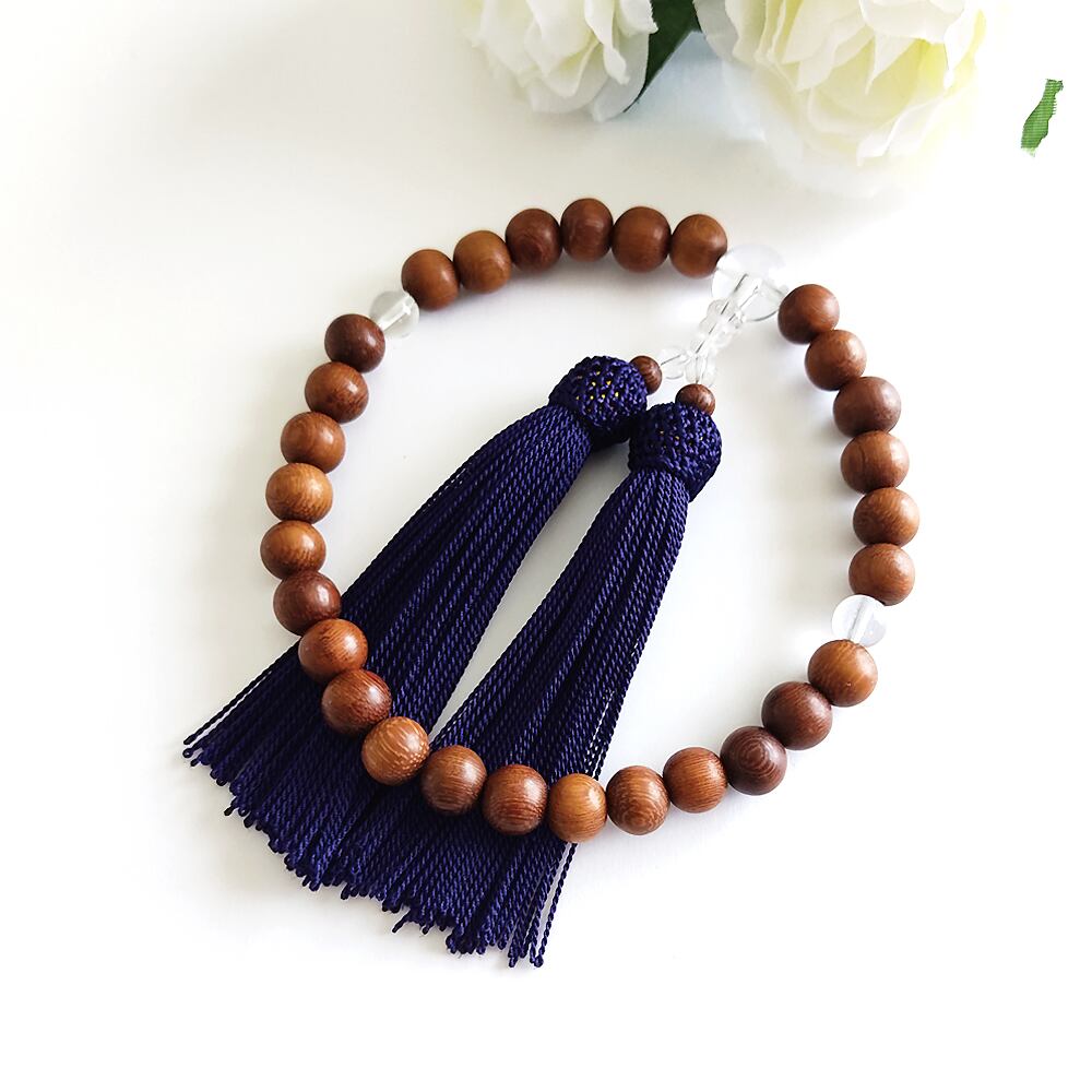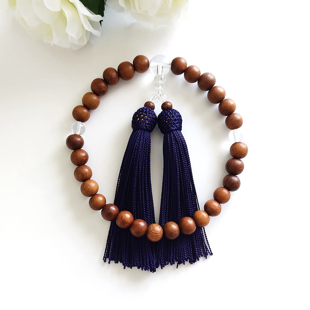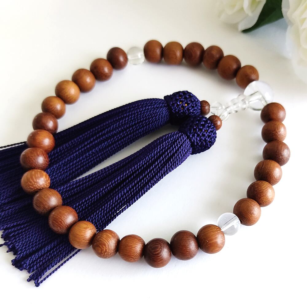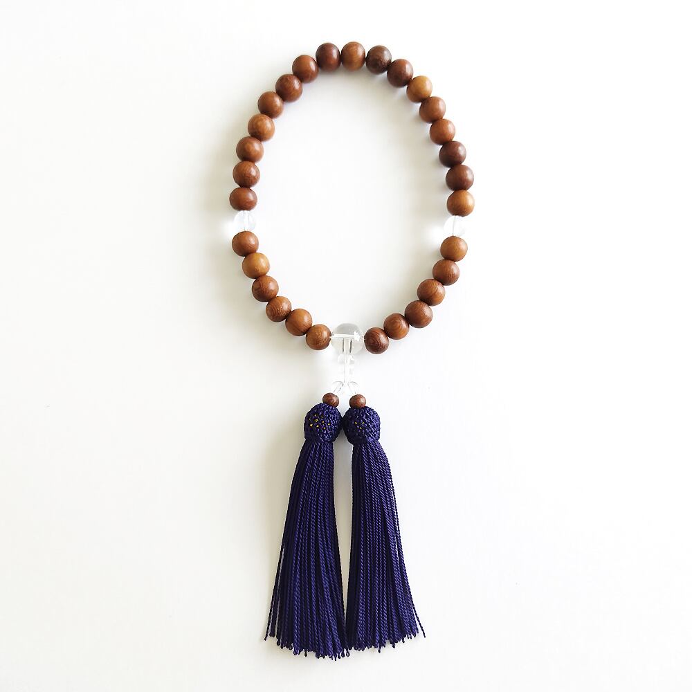 小粒すぎず大粒すぎない10mmのブラウンウッドを主玉に、親玉や二点玉を水晶でそろえたシンプルな略式数珠です。