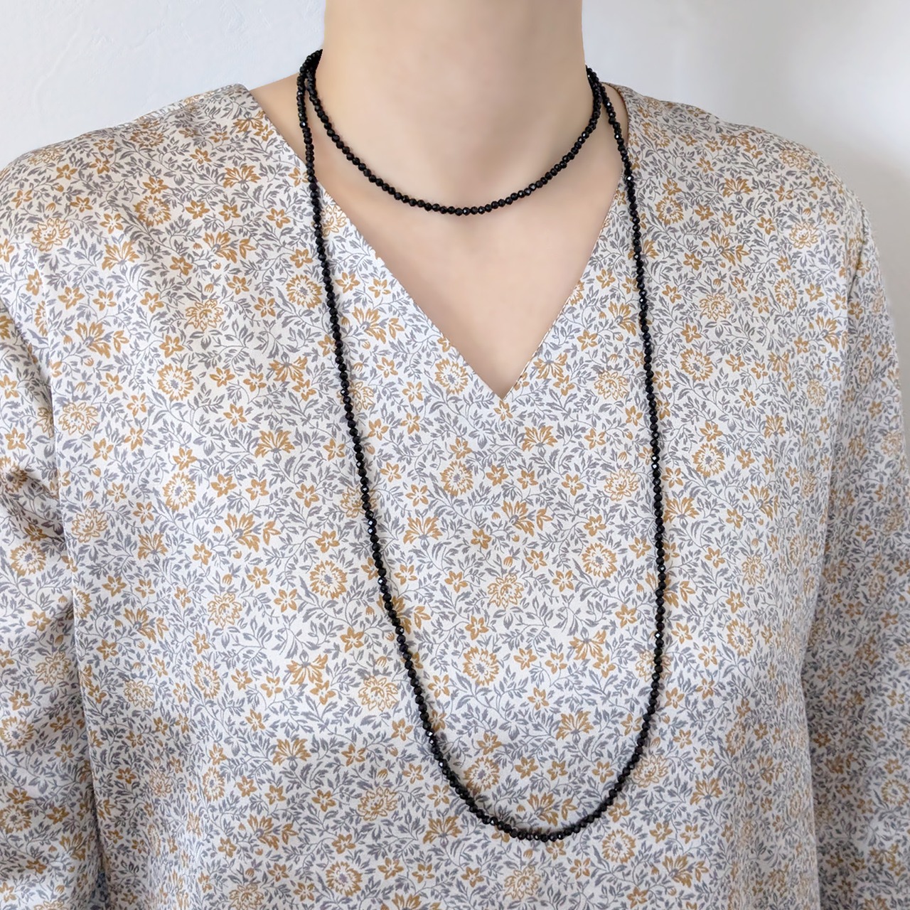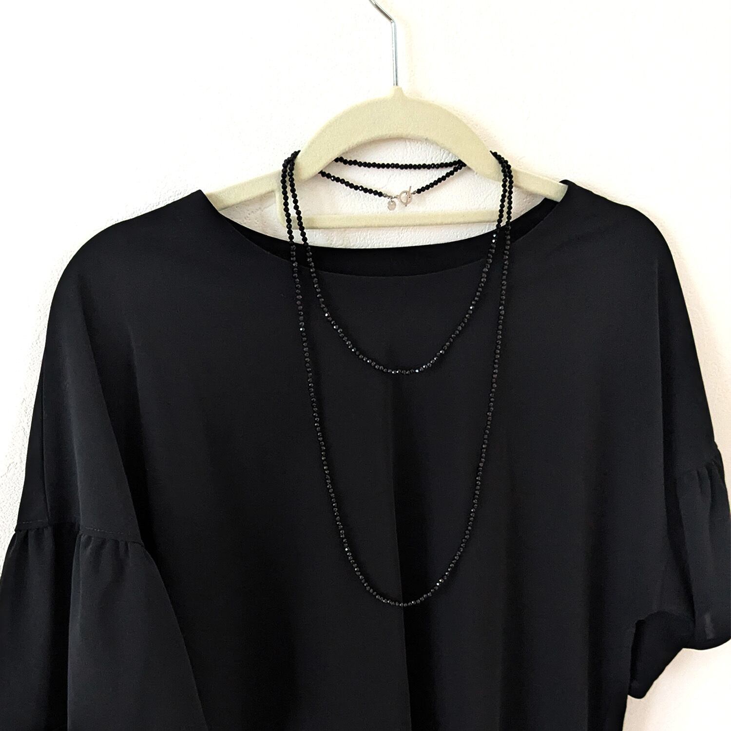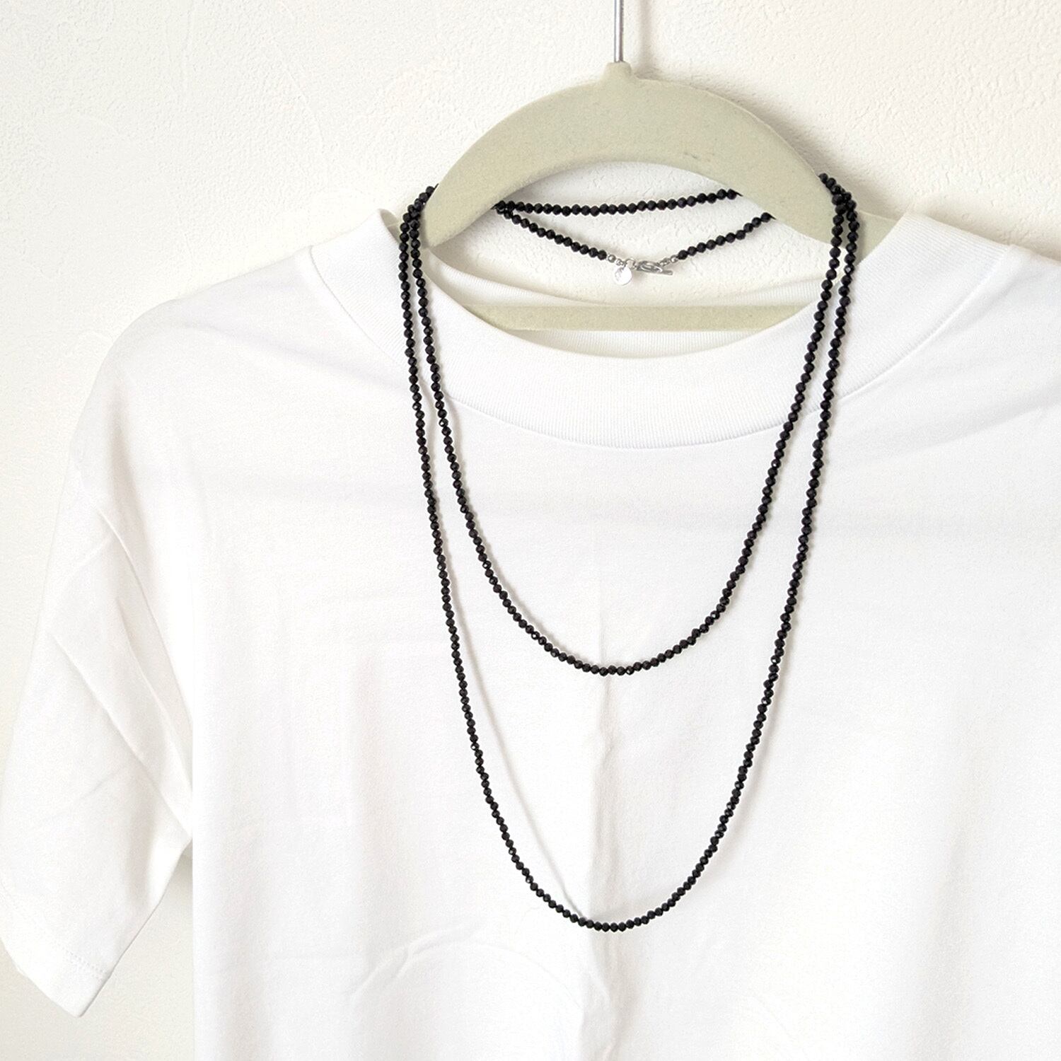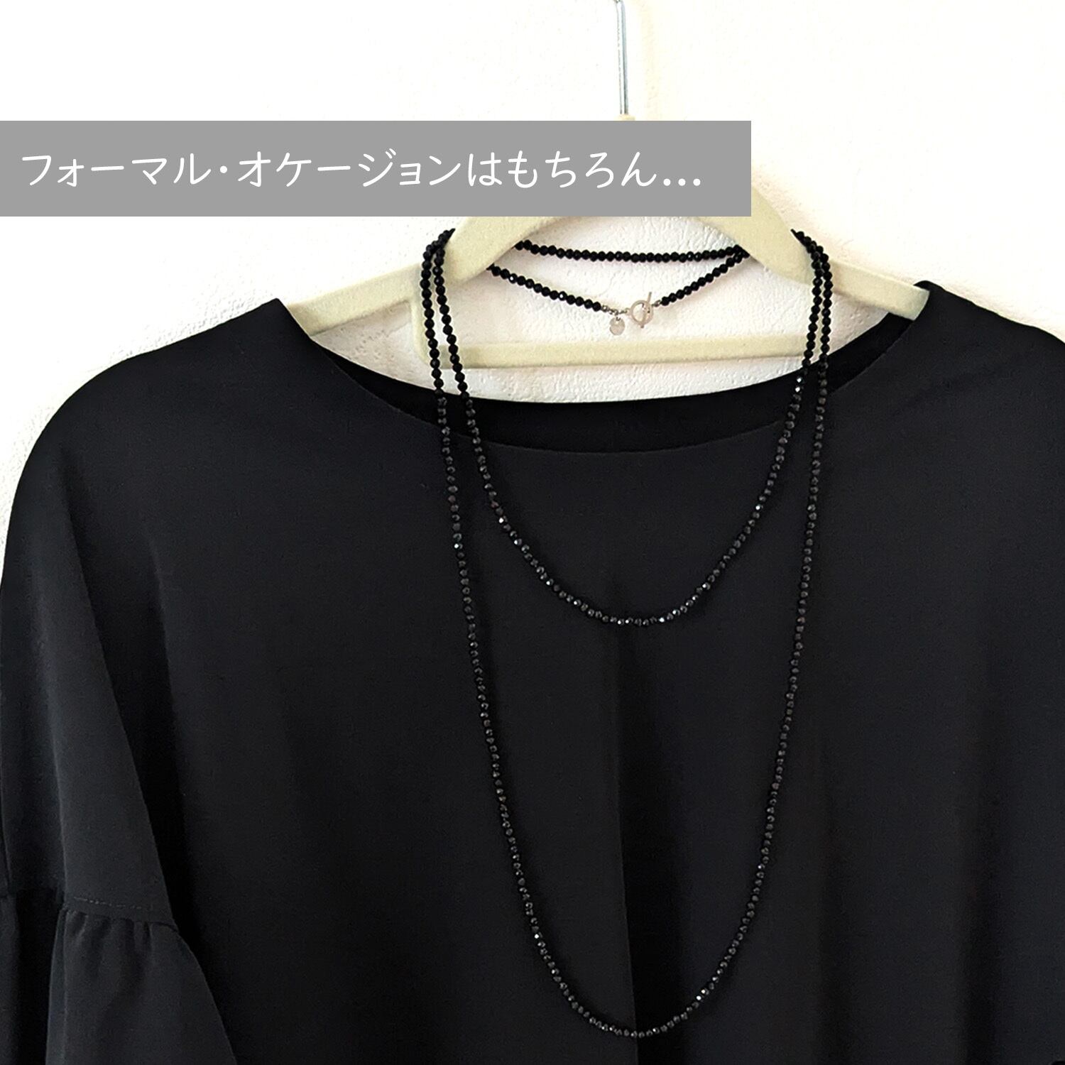 フォーマルな場面から普段の装いにもお使いいただける、極小3mmラウンドカット・オニキスのロングネックレスです。