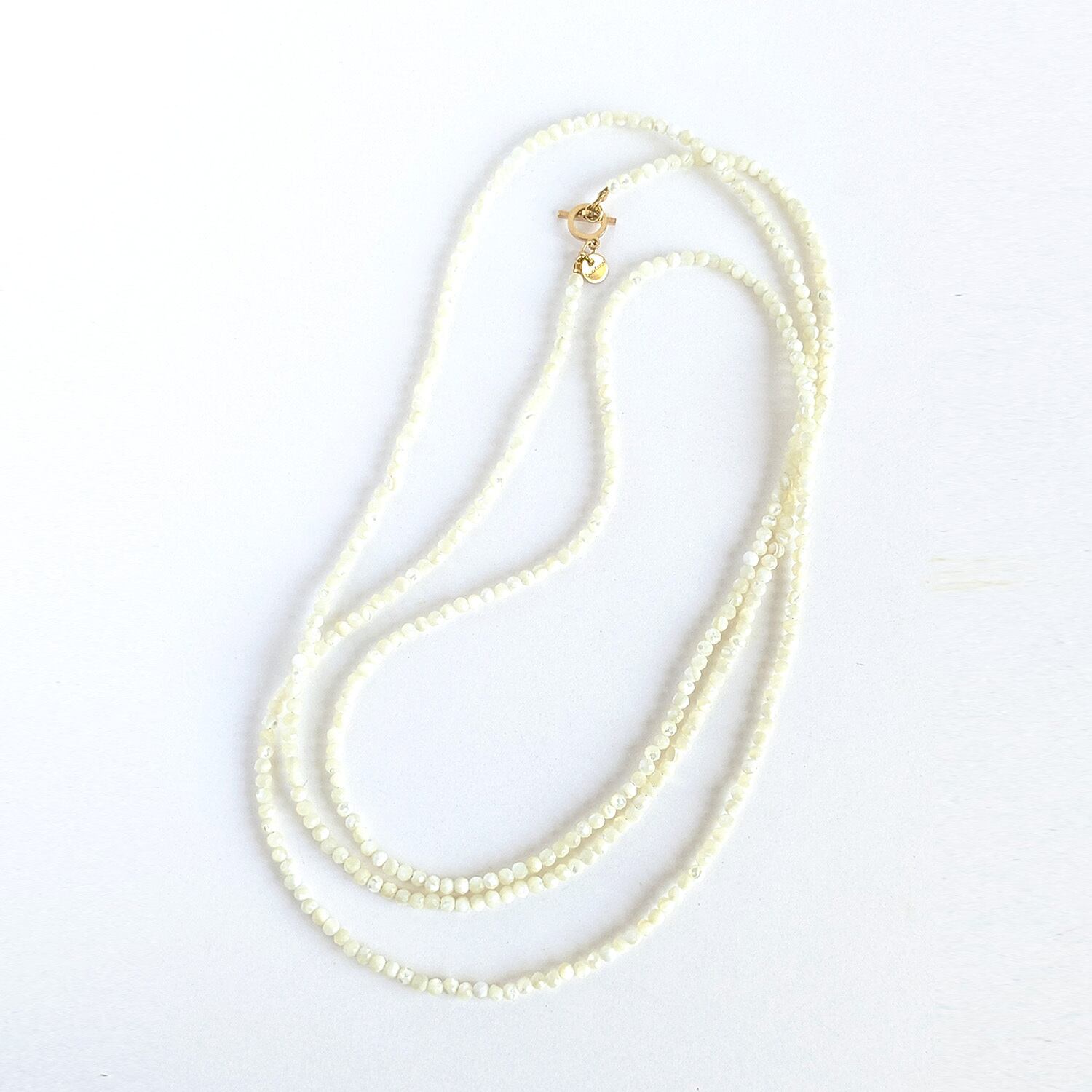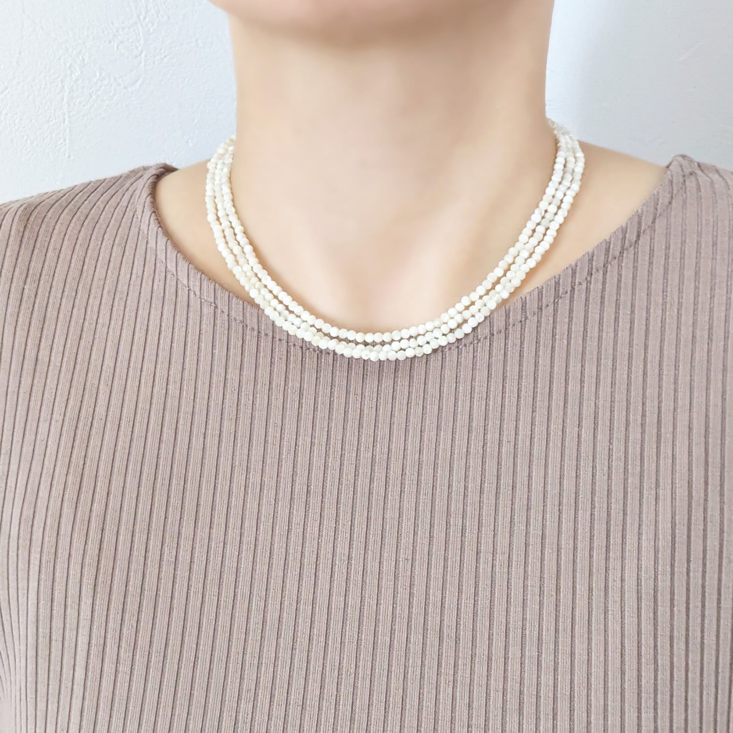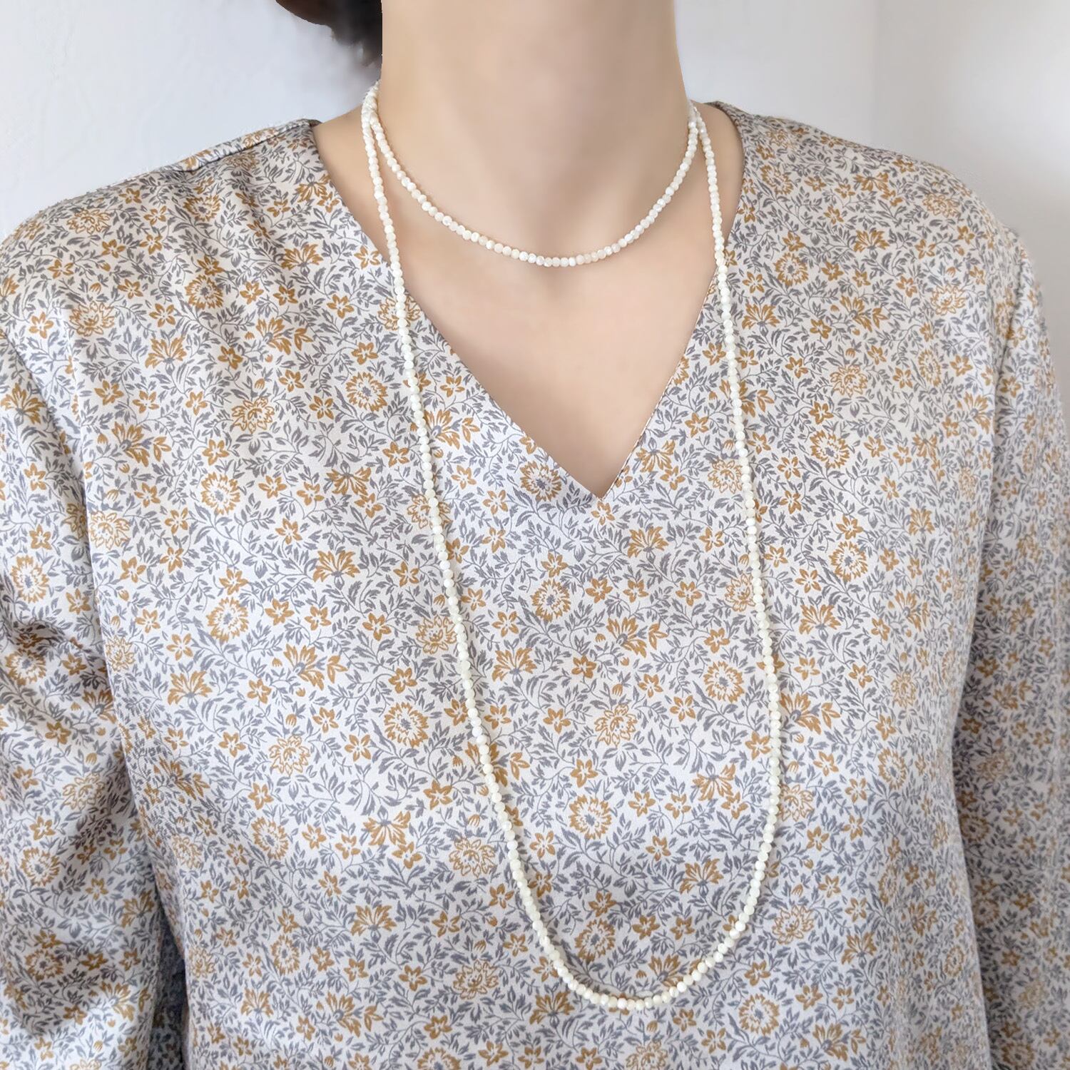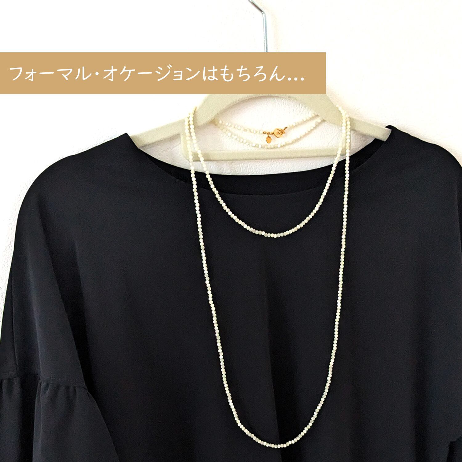 フォーマルな場面から普段の装いにもお使いいただける、極小3mmラウンドカット・マザーオブパールのロングネックレスです。