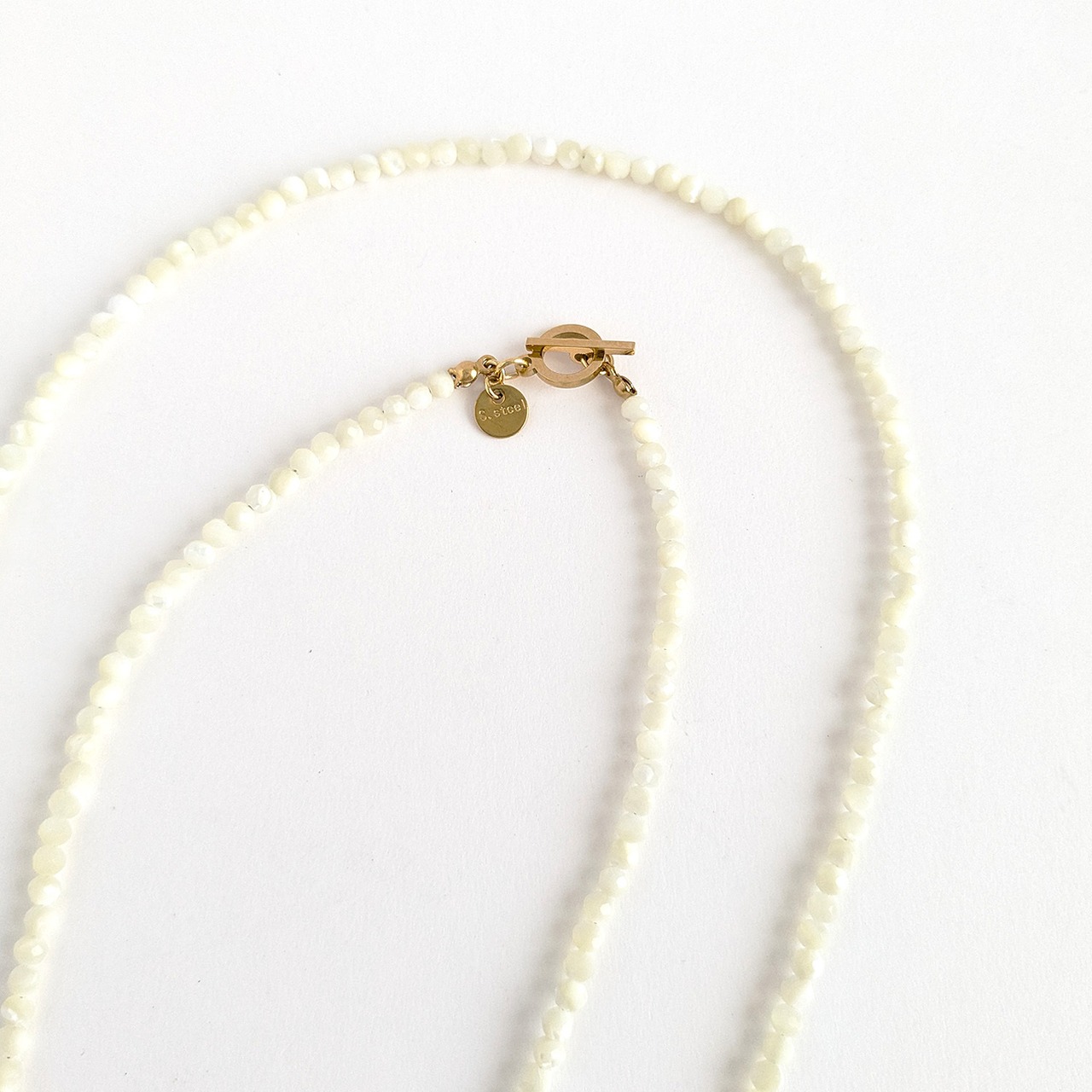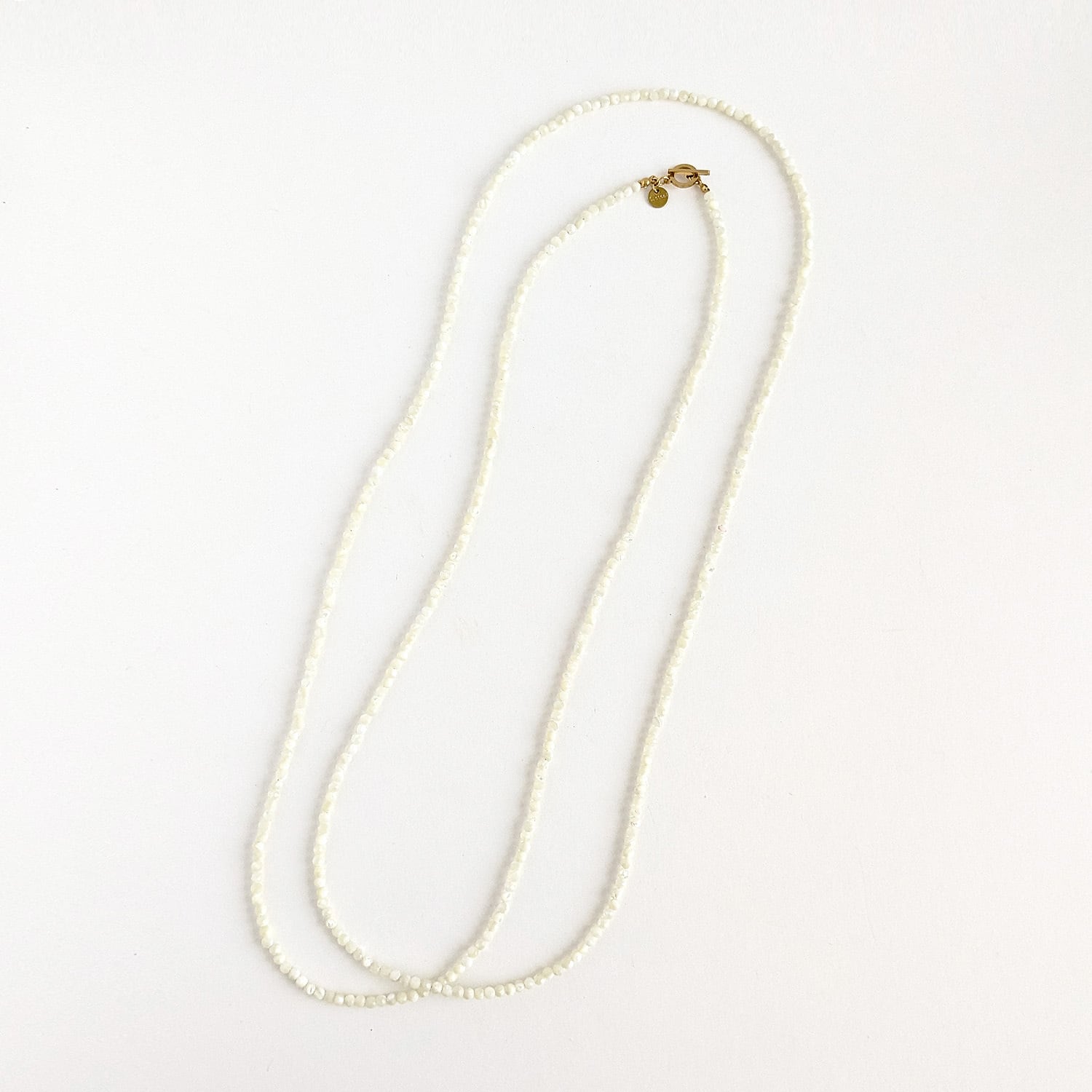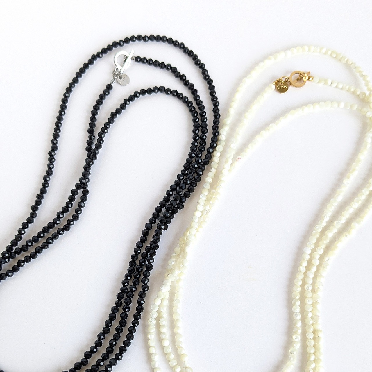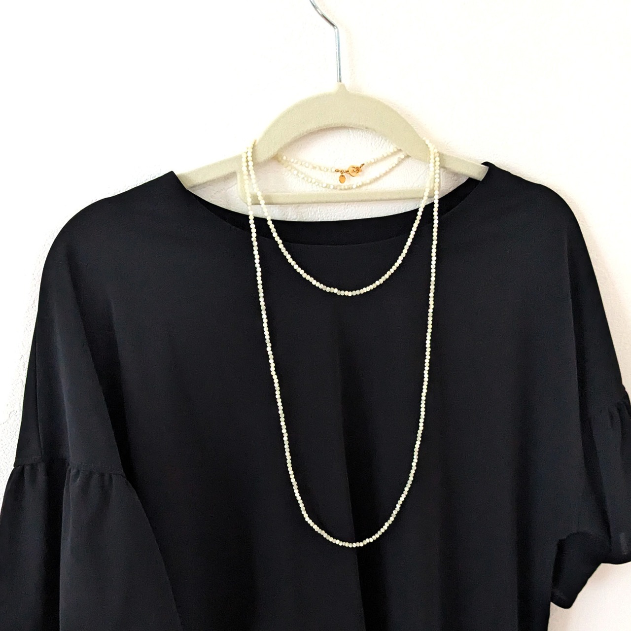 フォーマルな場面から普段の装いにもお使いいただける、極小3mmラウンドカット・マザーオブパールのロングネックレスです。