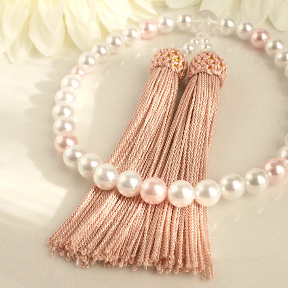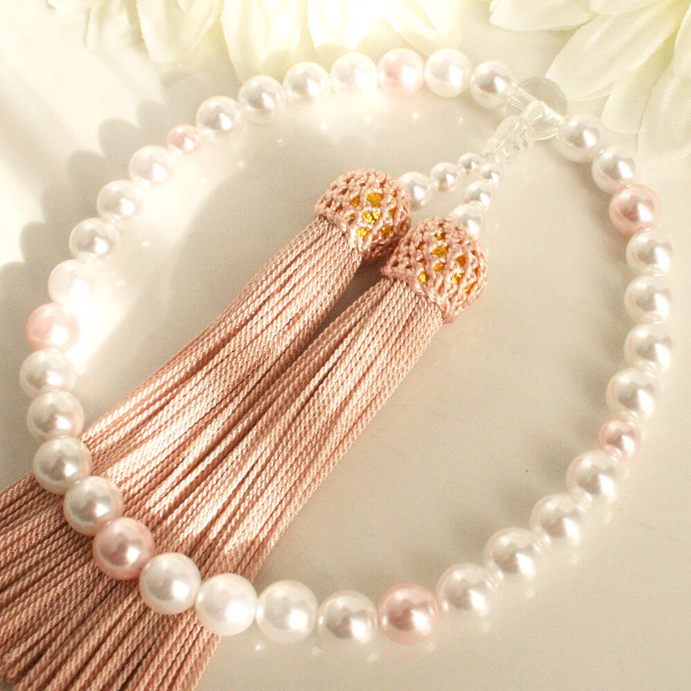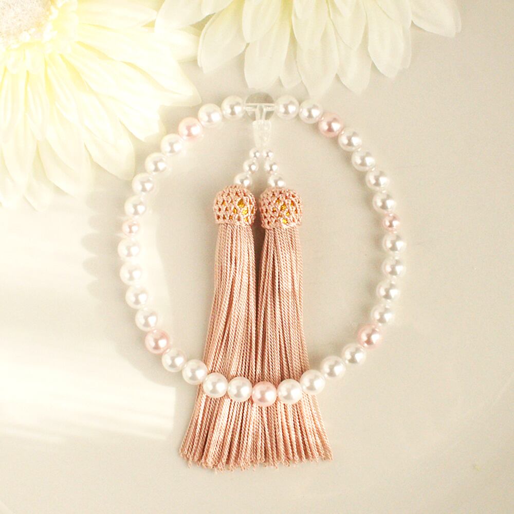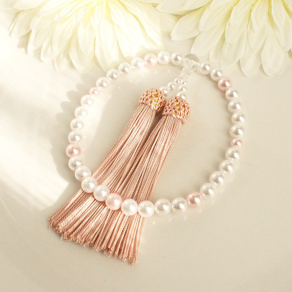 ホワイトパールの羅列の中で水玉模様のようにピンクパールを散らした略式数珠です。